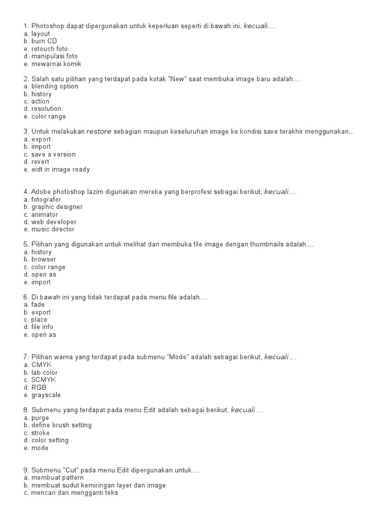Mencari dan mengganti seleksi e. Submenu Cut pada menu Edit dipergunakan untuk. Contoh soal dan photoshop dan jawabannya bagian kedua pada tulisan ini merupakan kelanjutan dari contoh soal photoshop bagian pertama yang bisa Anda baca pada tulisan Contoh Soal Photoshop Beserta Jawabannya Pilihan Ganda Lengkap yang terdiri dari 10 soal.
