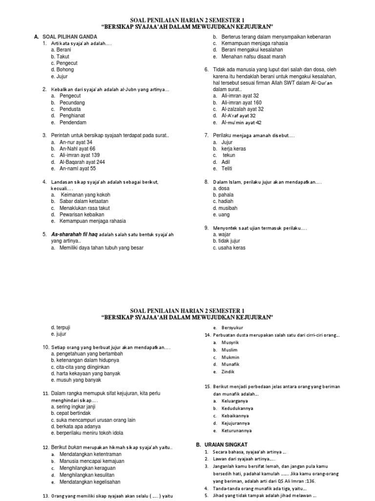 Soal Penilaian Harian 2 Semester 1 Bersikap Syajaa Ah Dalam Mewujudkan Kejujuran