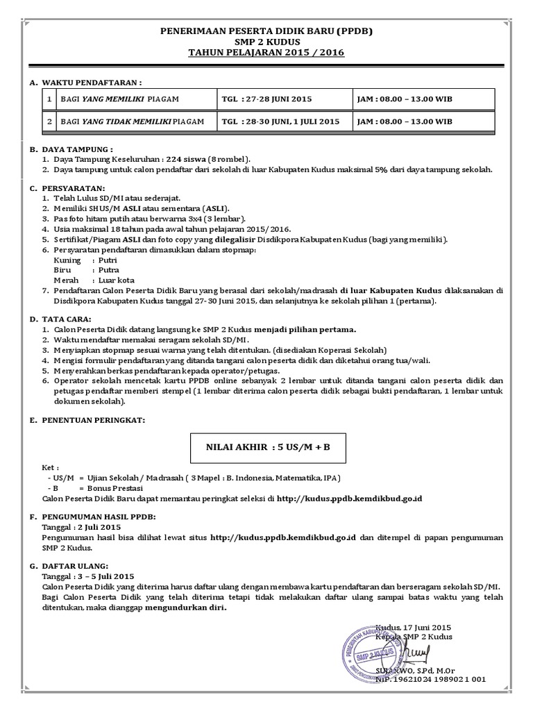 Kepala Sekolah SMP 1 Mejobo Ibu Dian Handayani SPd MPd. Selamat menjalankan tugas di tempat yang baru untuk eks. PPDB SMP 2 Kudus TP20152016 PENERIMAAN PESERTA DIDIK BARU PPDBSMP 2 KUDUSTAHUN PELAJARAN 20152016 A.