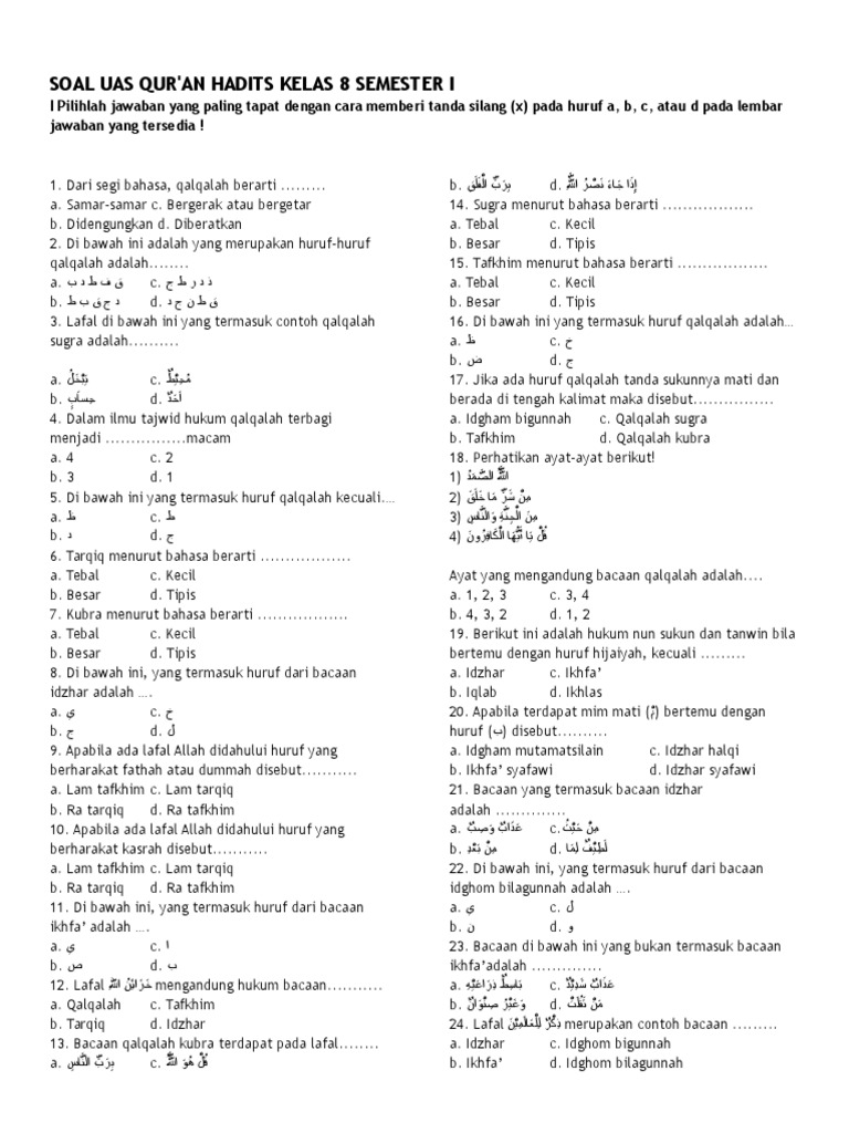 Soal Ujian Quran Hadits Kelas 8 Semester 2 Helmi Kediris